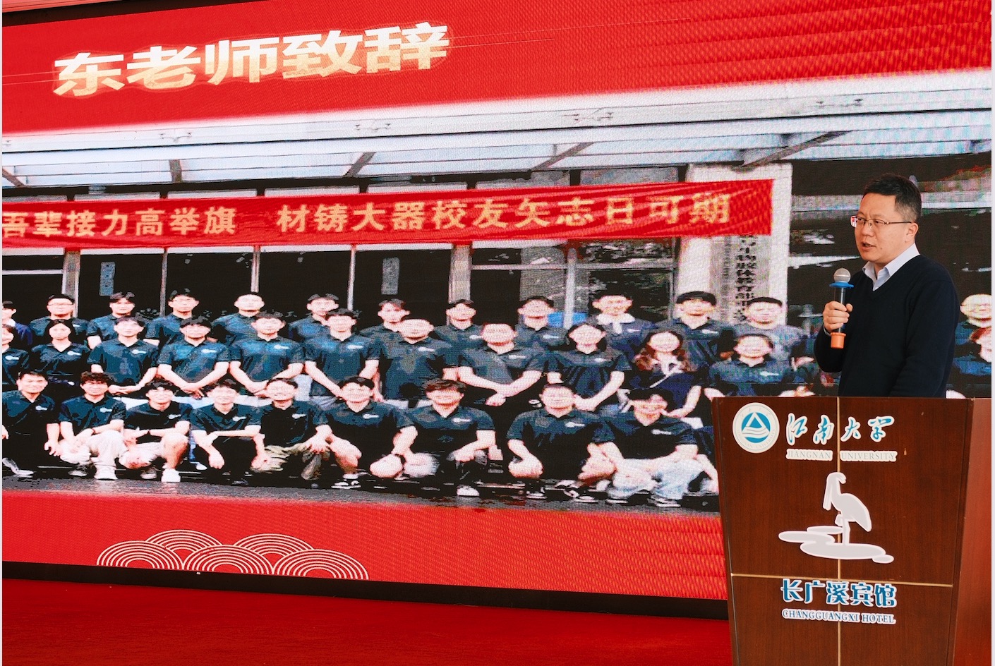 活动伊始,东为富教授发表开场致辞,为本次活动拉开序幕。致辞中,东教授全面梳理了研究中心2025年度在科研攻关、人才培养、团队建设、学术交流等方面取得的一系列标志性成果——从新型功能高分子材料的研发突破、高水平学术论文的发表,到科研项目的顺利推进、研究生培养质量的稳步提升,每一项成绩的取得,都凝聚着全体师生的心血与汗水。东教授代表中心,向一年来兢兢业业、默默奉献的全体老师,以及勤奋钻研、勇于探索的全体研究生致以最诚挚的感谢和最崇高的敬意。同时,他结合马年新春寓意,送上了殷切祝福,勉励全体成员在新的一年里,秉持科研初心,勇攀学术高峰,以龙马精神般的劲头,凝心聚力、奋勇争先,共同推动研究中心各项工作再上新台阶。
